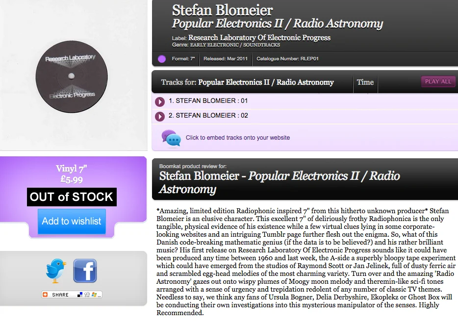 Fictionally presented as a back catalogue of found and restored material with accompanying visual content, the project received a 1st Class Honors, a feature on Resonance 104.4 FM and a critically acclaimed 7" vinyl single, self released under my Stefan Blomeier alias that was listed as "Single of the week" by Boomkat in March 2011.